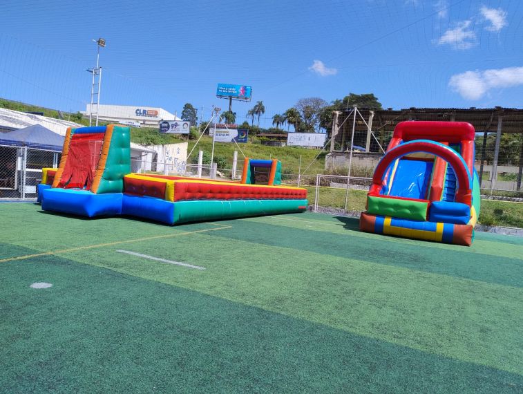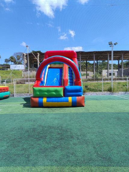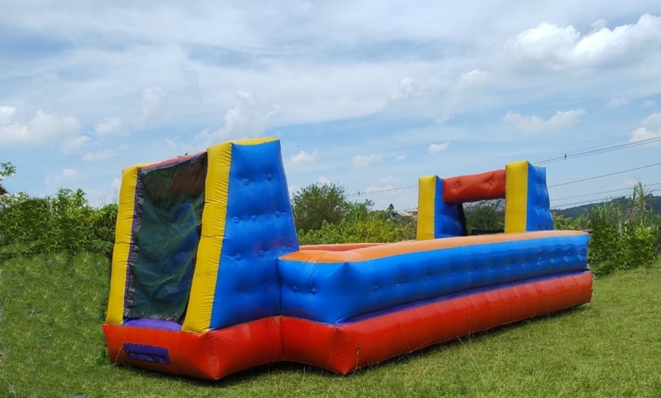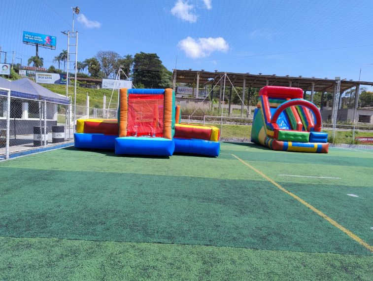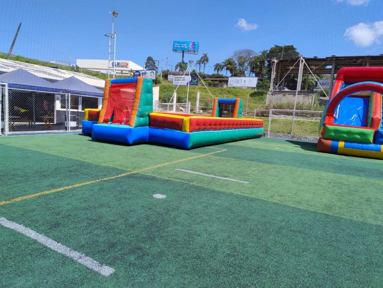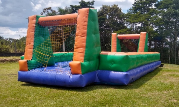 Quadra poliesportiva especialmente adaptada para brincar de futebol, vôlei e basquete. Possui exclusivas faixas contínuas que protegem o usuário de se machucar na queda, garantindo segurança e muita diversão. Ideal para buffet infantil, festas e locação